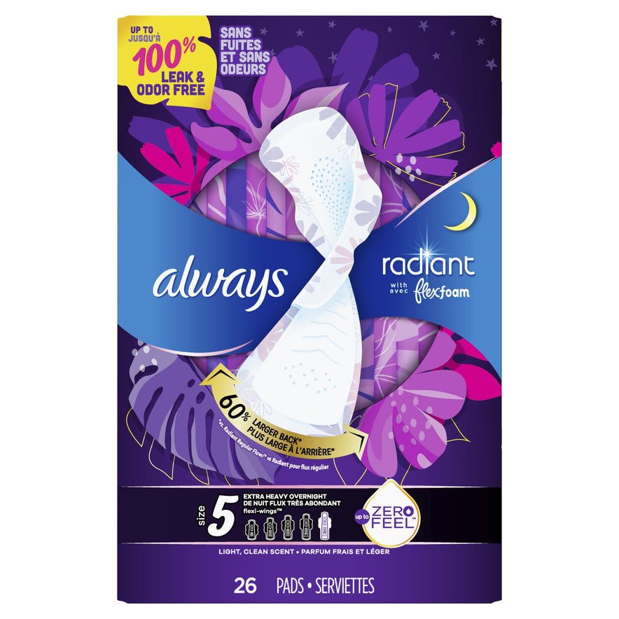 Try Radiant FlexFoam for a pad that gives you style, protection, AND comfort! With Always Radiant Feminine Pads with Wings, Size 5, Extra Heavy Overnight Absorbency, Scented, 26 CT period pads, a 100% leak and odor free protection is possible so you can wear what you want and do what you want any day of the month! FlexFoam has a 60% wider back for up to 12hrs of worry-free protection. Even on heavy days, FlexFoam pads absorb 10x their weight. Always Radiant is made with FlexFoam for a thin and flexible pad that doesn't skip out on protection. Feel radiant with the "neon vibes" package and wrapper designs, because pads don't have to be boring. Always FlexFoam pads are dermatologically tested, and approved as skin friendly by the Skin Health Alliance. Always products are FSA/HSA Eligible.