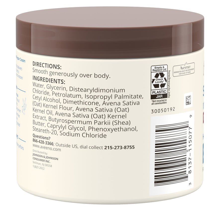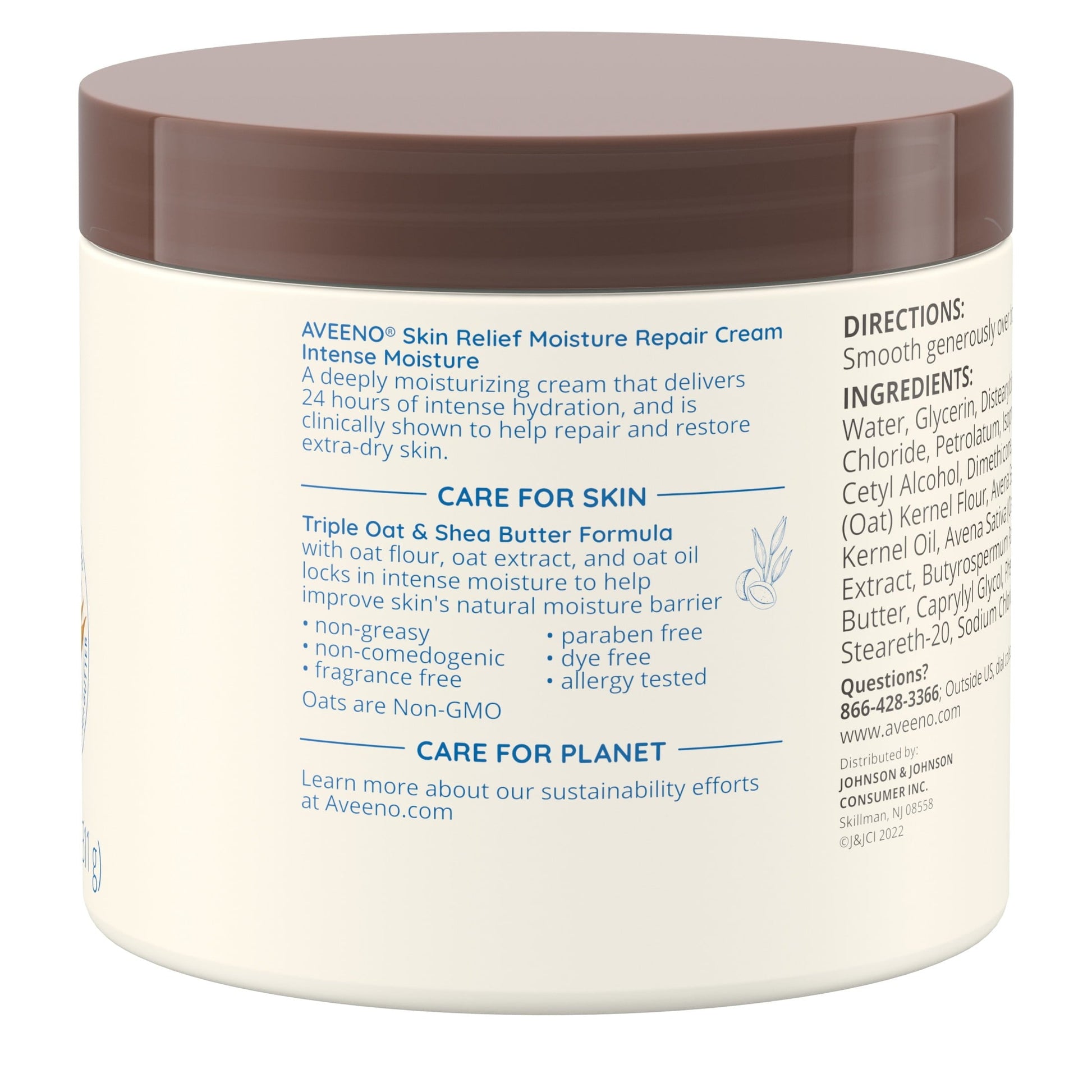 Aveeno Skin Relief Moisture Repair Fragrance-Free Body Cream provides intensive moisture to help relieve extra-dry skin. It features a unique proprietary formula that prevents moisture loss and helps relieve and restore extra-dry skin with long-lasting moisture, and provides clinically proven soothing relief for dry skin with 24-hour moisture. With a soothing Triple Oat and Shea Butter formula, this moisturizing body cream with oat flour, oat extract and oat oil locks in intense moisture to help improve skin's natural moisture barrier. The non-greasy moisture repair cream is allergy tested, non-comedogenic and free of fragrances, parabens and dyes. Aveeno uses the goodness of nature and the power of science to keep your skin looking healthy and feeling balanced. Experience all-day, intensive moisture and help heal extra-dry skin with this unscented moisturizing cream, from the dermatologist-recommended skincare brand for over 70 years.