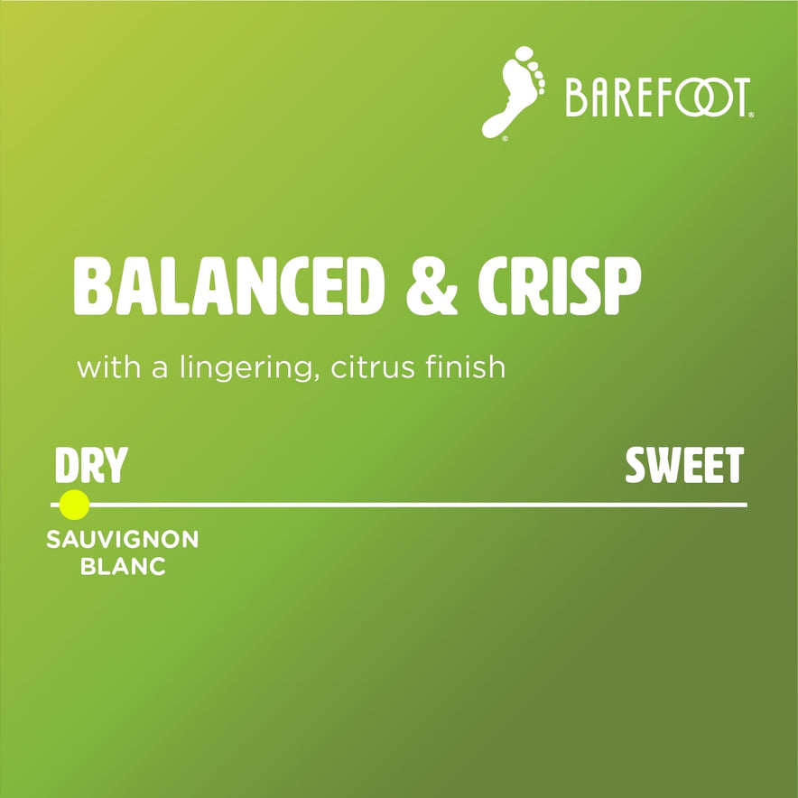 Barefoot Sauvignon Blanc Dry White Wine features crisp notes of refreshing honeydew melon, sweet nectarine and juicy peaches in a larger 1.5 L bottle that's perfect for entertaining. Finished with a delicious hint of zesty lime and pear, this aromatic California white wine pairs perfectly with a fresh vegetable tray or assortment of mild cheeses. This crisp and refreshing Barefoot wine is best served chilled, and the larger bottle contains two 750 mL bottles of wine, making it ideal for entertaining and parties. This Sauvignon Blanc wine comes from Barefoot, the most awarded wine brand in US competitions. Let's get Barefoot. Comes in a glass bottle that is 100% recyclable.