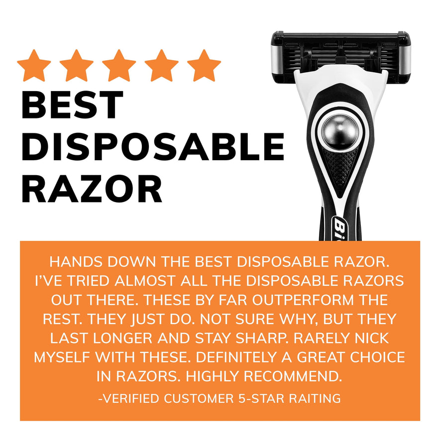 Experience a close, comfortable shave with BIC Flex 5 Refillable Men’s Razors. Bring home a dependable 4-piece razor kit for men that contains one handle and three cartridges. The five ultra-thin flexible blades are titanium coated for added durability and longer-lasting* use. Together with the rubber guard, the five blades help the BIC Flex 5 Refillable Razors for Men deliver a close, efficient shave. Each razor has a lubricating strip enriched with aloe and vitamin E for enhanced glide, as well as a precision edging blade that helps you reach tricky spots. To provide more control while shaving, the BIC Flex 5 men's razors for shaving have a 40-degree pivoting head that moves with the contours of your skin and an ergonomic handle with an anti-slip grip. The BIC Flex 5 5 blade razors are great shavers for face, head and body use. When you’ve used all of the razor cartridges, simply purchase a new set of refills (refills sold separately). Get a comfortable, yet affordable shave when you choose BIC Flex 5 Refillable Razors. *Vs. BIC Sensitive.