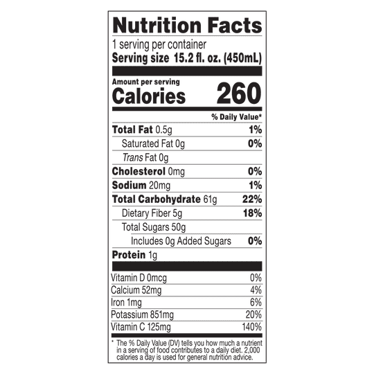 3¾ SERVINGS OF FRUIT PER BOTTLE [One serving equals 1/2 cup of juice. Daily recommendation: 4 servings of a variety of fruit, including whole fruits, for a 2,000 calorie diet (MyPlate). Not a low calorie food]