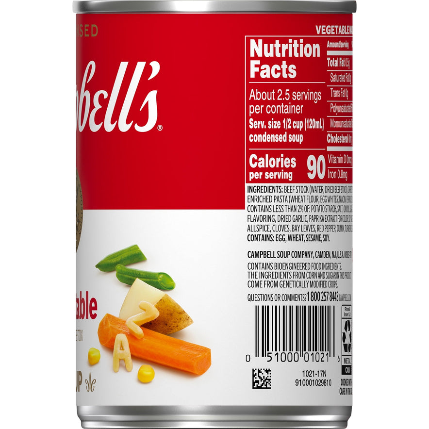 Campbell’s Condensed Vegetable Soup warms the soul and has earned its place in the pantry as a family favorite. Join Campbell’s in the kitchen by customizing this soup with fresh avocado, or pair it with crackers. Campbell’s Vegetable Soup starts with farm-grown veggies like carrots, potatoes, and green beans with letter-shaped pasta in a savory beef stock. The end result is a soul-warming vegetable soup that brings a smile with every spoonful. M'm! M'm! Good! This product is packaged in a metal can, and is shelf-stable/ambient.