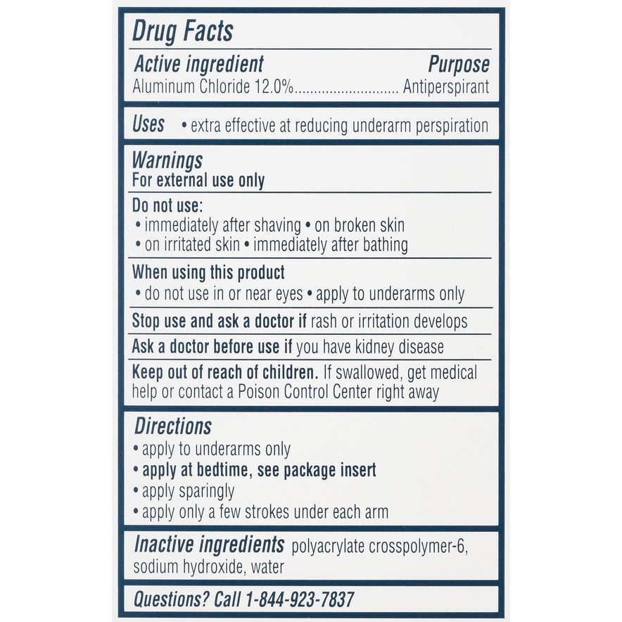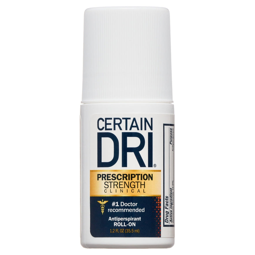 Stop sweat before it starts with Certain Dri Clinical Prescription Strength Antiperspirant. Certain Dri featuresaluminum chloride one of the most powerful ingredients against hyperhidrosis (excess sweating). According to laboratory studies, this ingredient has been shown to be highly effective at treating the condition and reducing underarm wetness for up to 72 hours. Certain Dri antiperspirant is so effective at stopping sweat, it's the #1 doctor-recommended formula available without a presecirption. The roll-on formula glides on easily, keeping you cool, dry and comfortable. For best results, apply the antiperspirant roll on to clean, dry underarms before bed; this allows the active ingredient to permeate the skin. The powerful formula won't wash off, even after bathing, for effortless regular use. Each bottle contains 1.2 fl oz.