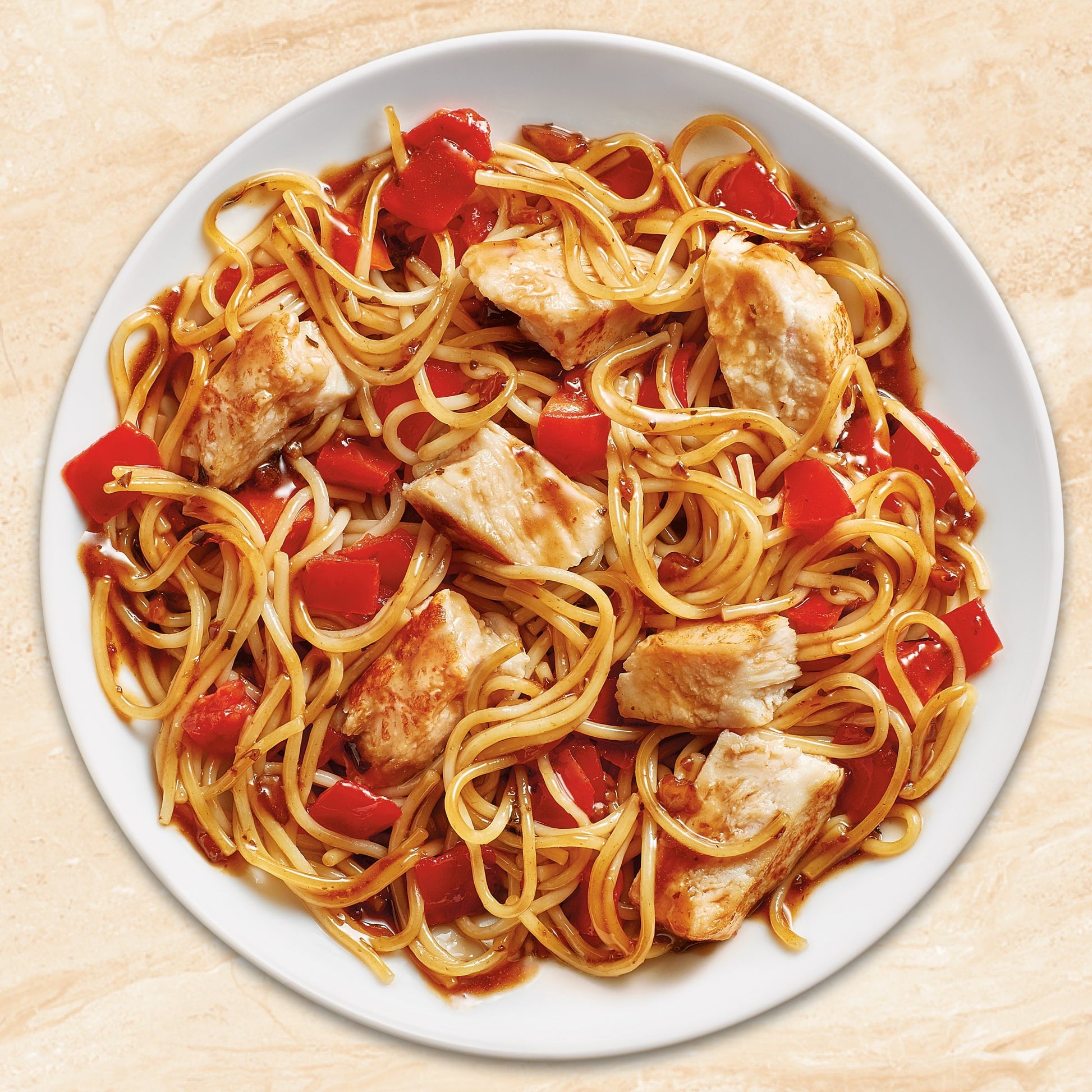 This frozen dinner includes grilled chicken breast, angel hair pasta, roasted garlic and tomatoes in balsamic vinaigrette sauce