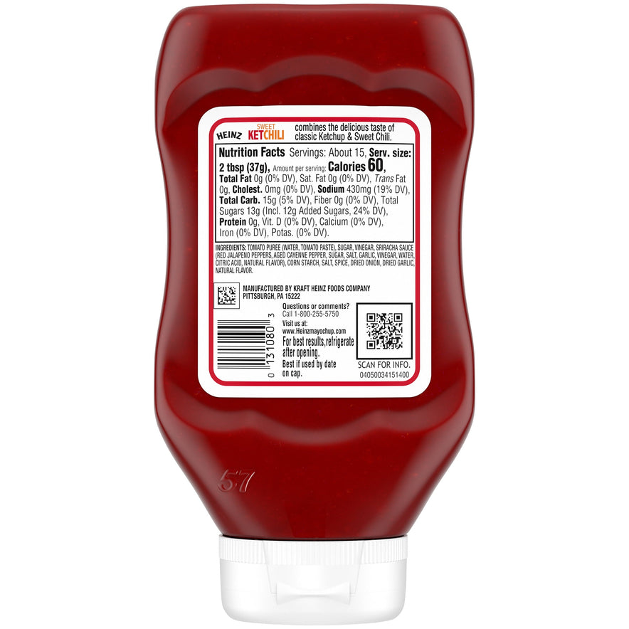 Mixing delicious ketchup with the spicy kick of sweet chili sauce, Heinz Sweet Ketchili is in its own class of condiments. Heinz Sweet Ketchili is so versatile and perfect for dipping. It makes an excellent dipping sauce for fries and can be used as an alternative for regular hot sauce or ketchup on chicken nuggets, burgers and so much more. The 15.5-fluid ounce squeezable, resealable bottle is easy to use and transport to picnics and dinner parties. Sweet Ketchili Sauce boasts a special sweet and spicy flavor that is sure to be a hit for all ages.