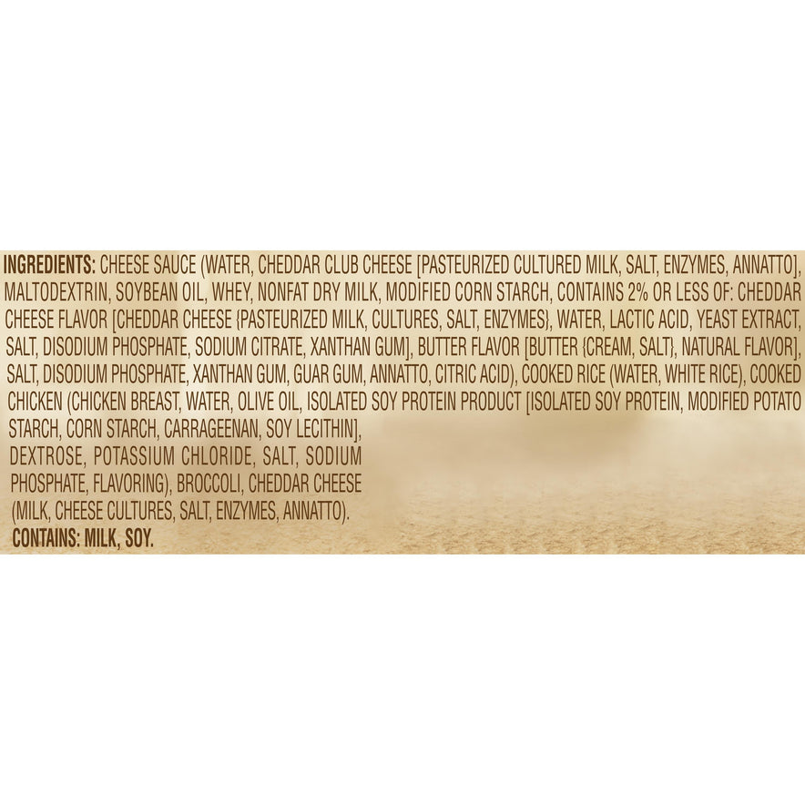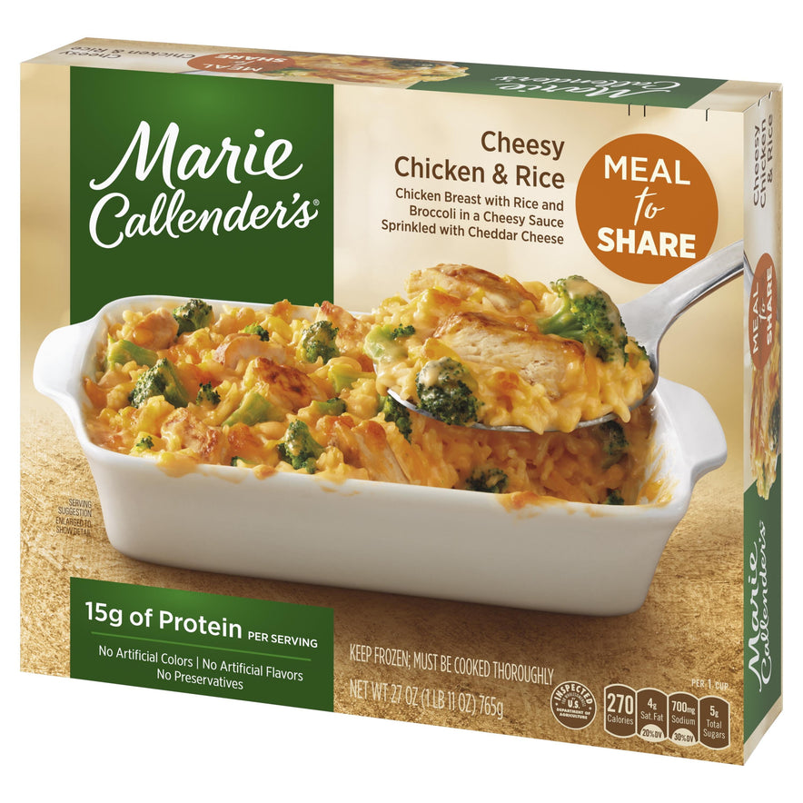 Marie Callender's Cheesy Chicken & Rice Meal for Two combines premium chicken breast with delicious rice and broccoli. Covered in a creamy made-from-scratch cheese sauce and sprinkled with aged cheddar, it's the ultimate comfort food—for two! With 25 g protein per serving and no preservatives, artificial colors, or artificial flavors, this convenient meal can be microwaved or heated in the oven. Enjoy a warm, hearty, and delicious meal today—and share it with someone special.