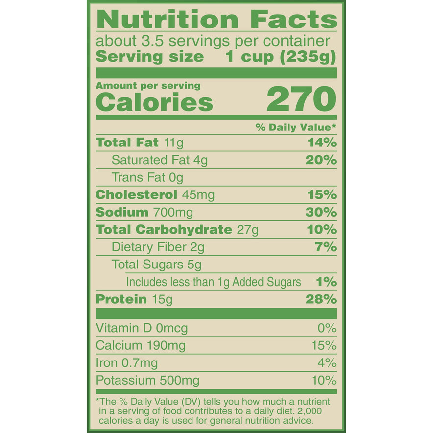 This flavorful dish has 25 g protein per serving and contains no preservatives, artificial flavors, or artificial colors