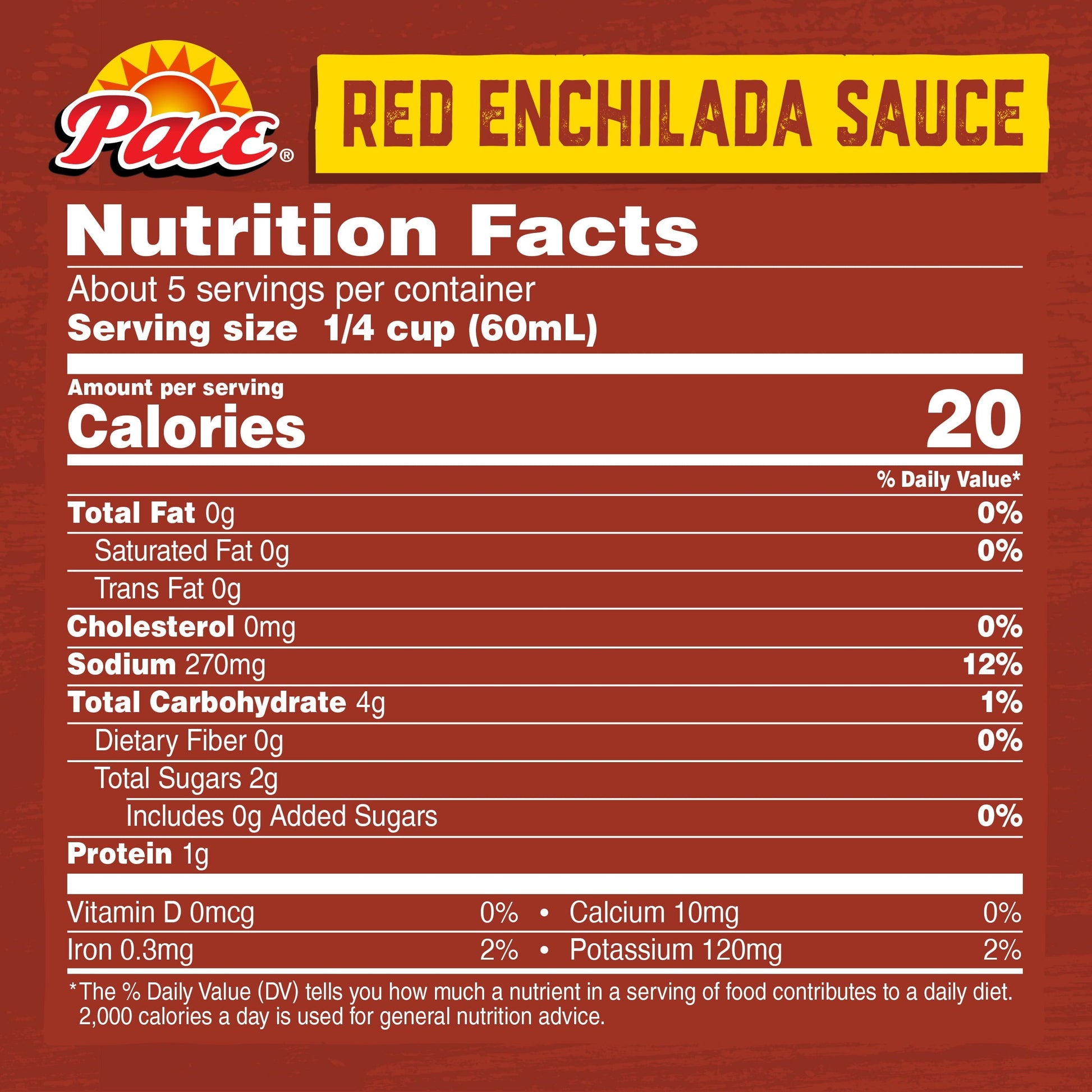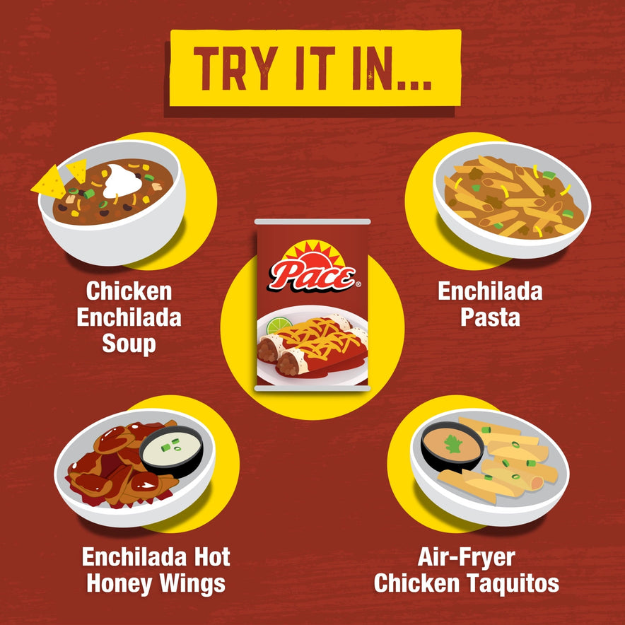 Be the hero on game day with Pace Mild Red Enchilada Sauce. Mild Red Enchilada Sauce will add that kick to any ordinary meal whether it's dinner time or lunch with friends and family. This canned Enchilada sauce adds rich, creamy flavor with a mild heat level so it's not too spicy. Try it in Chicken Enchilada Soup, Enchilada Pasta, Chicken Taquitos, Enchilada Hot Honey Wings, or use it as a base for ground beef. Use it as traditional enchilada sauce and have it drizzle over enchiladas or tortilla chips along with your other favorite toppings or use it as the base for a delicious nacho cheese dip with beans, ground beef and other favorite ingredients. This Mild Red Enchilada Sauce comes in a can for convenient storage in your pantry so you're always prepared when you have a craving for Enchilada Sauce. This product is packaged in a metal can, and is shelf-stable/ambient.