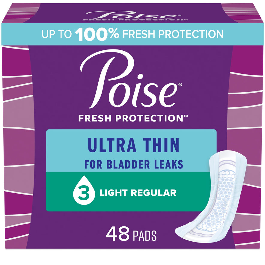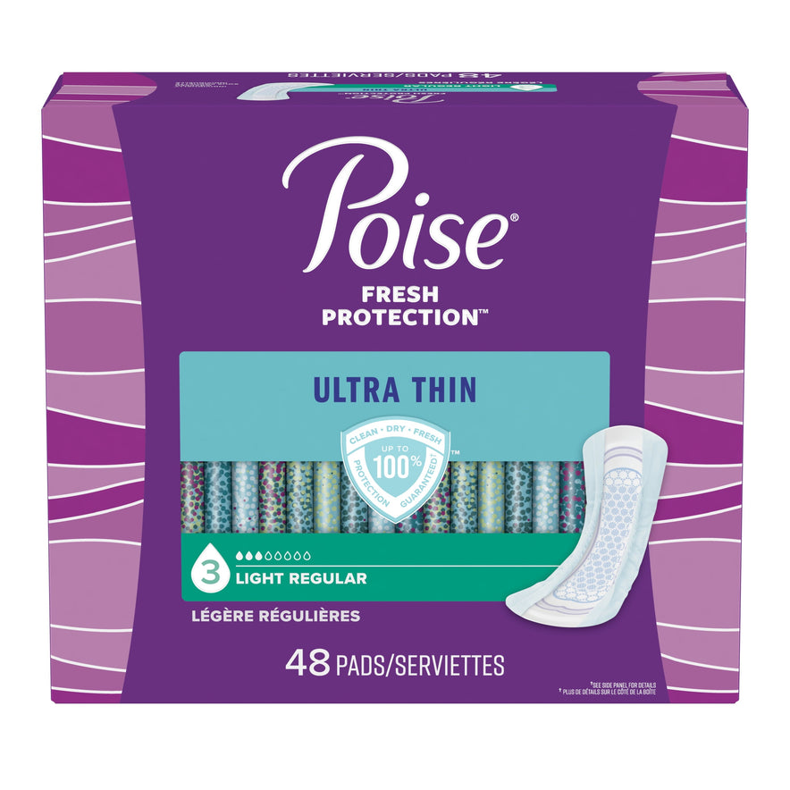 Poise Ultra Thin Incontinence Pads, Light Absorbency, Regular Length, 48 pads; HSA/FSA-eligible in the U.S. (packaging may vary).