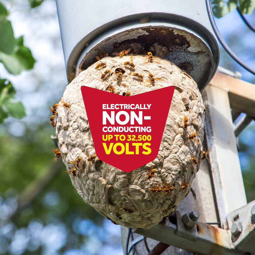 Raid Wasp & Hornet Killer 33 kills hornets, mud daubers, wasps and yellow jackets on contact and is electrically non-conducting up to 32,500 volts. It sprays up to 22 feet, allowing you to spray from a safe distance and is effective in killing the entire nest.